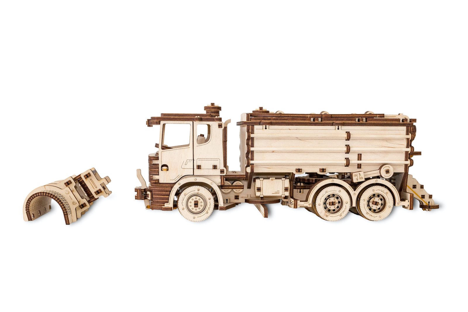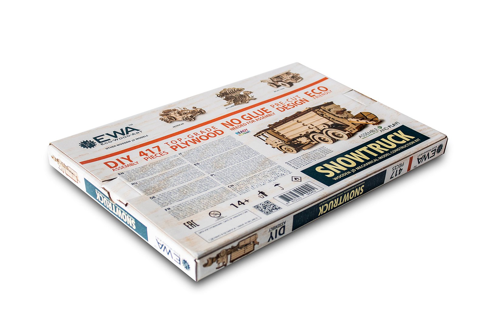 SNOWTRUCK — mechanical wind-up 3D-puzzle of the road maintenance truck with rubber-band engine. Rotating front wheels and central plough, the removable front plough, opening doors, moving back dispenser – every detail just like in a real snow truck!