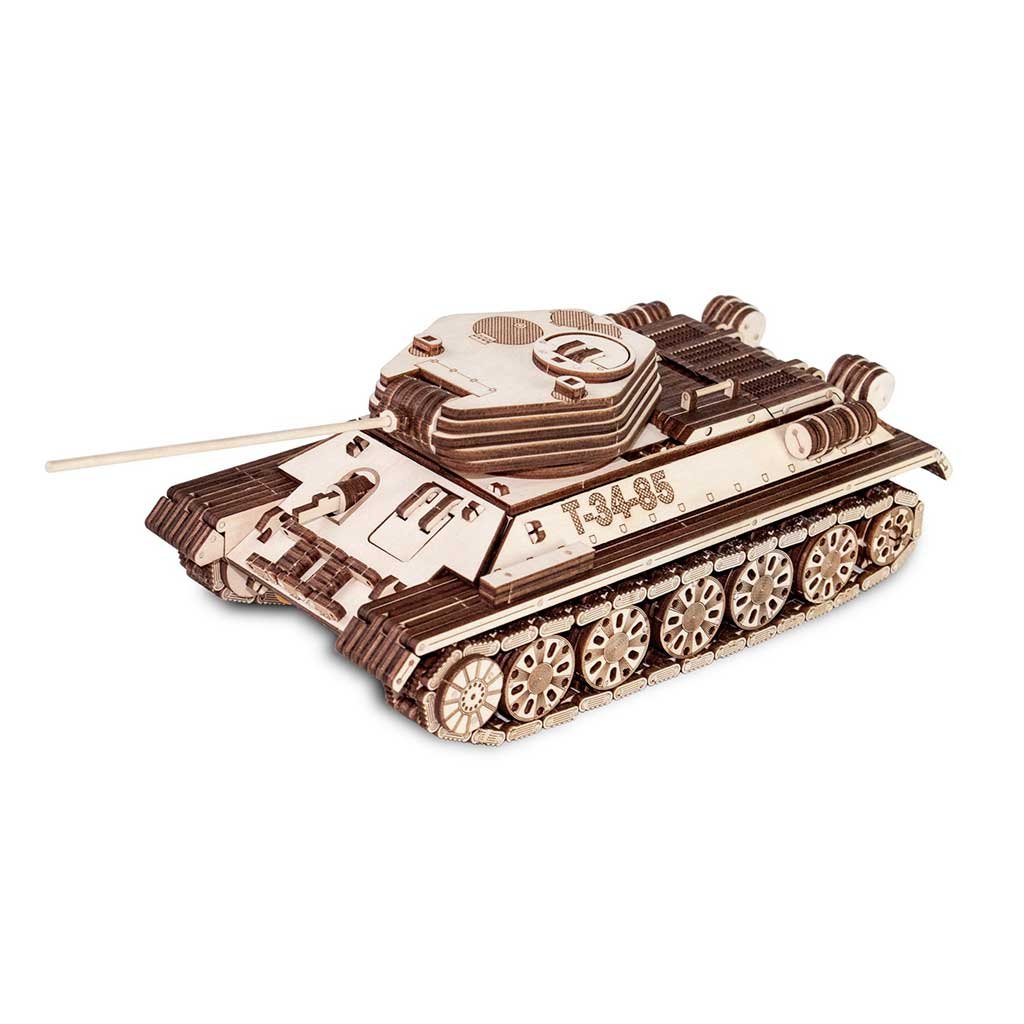 Mechanical 3D-puzzle of the the modified Tank T-34 – T-34-85. The model is realistic and high detailed copy of the tracked military vehicle built in 1944. It’s euqipped with a rubber-band engine with a removable key, rotating cannon, movable hatches and rolling wheels.