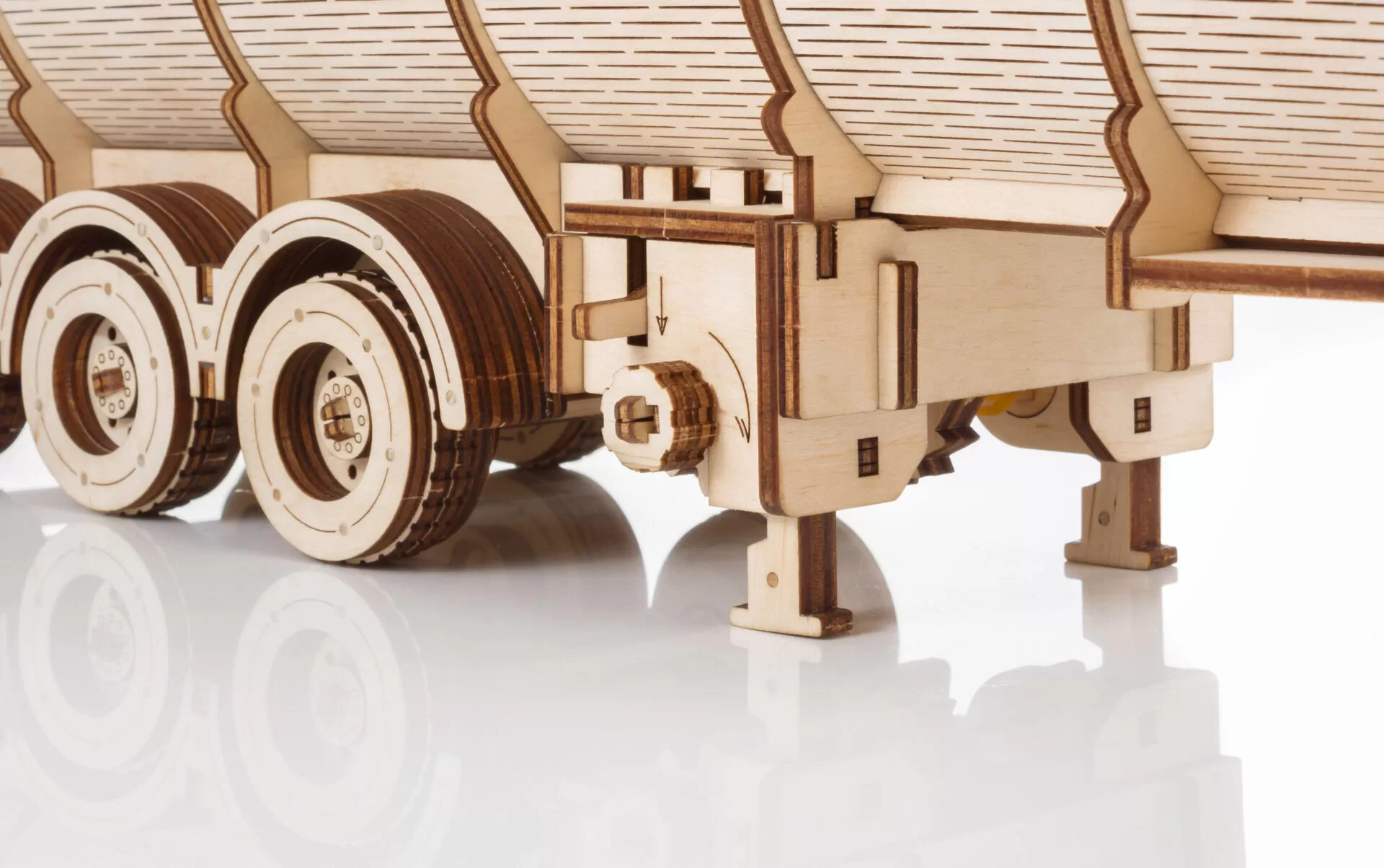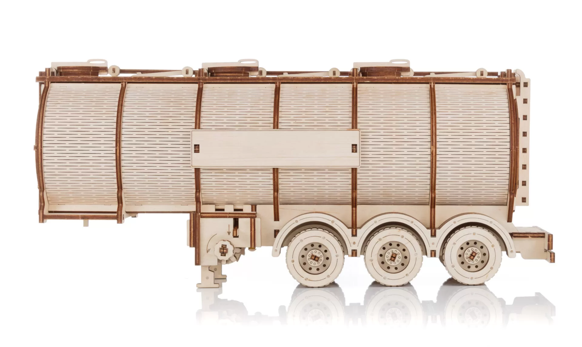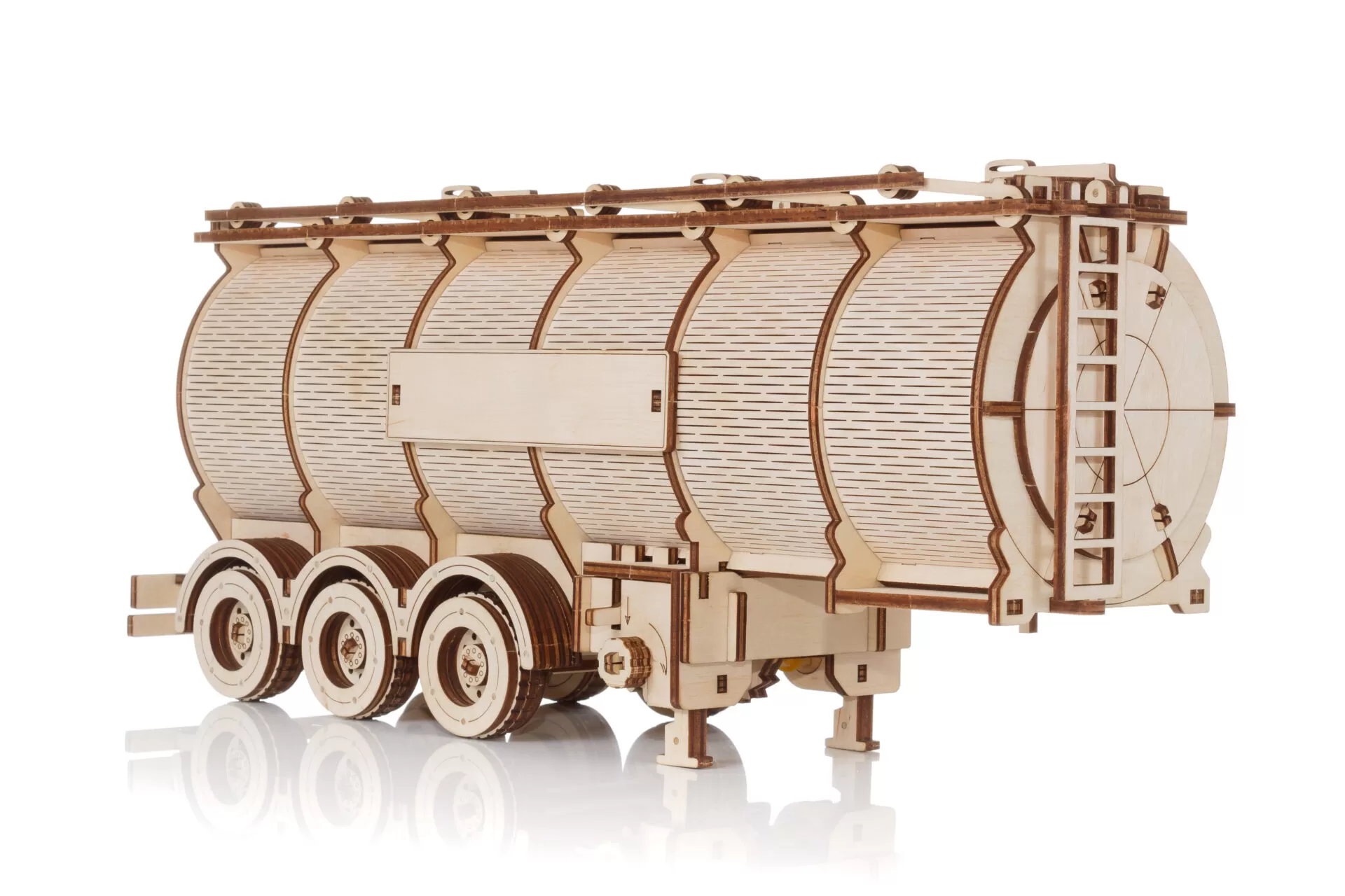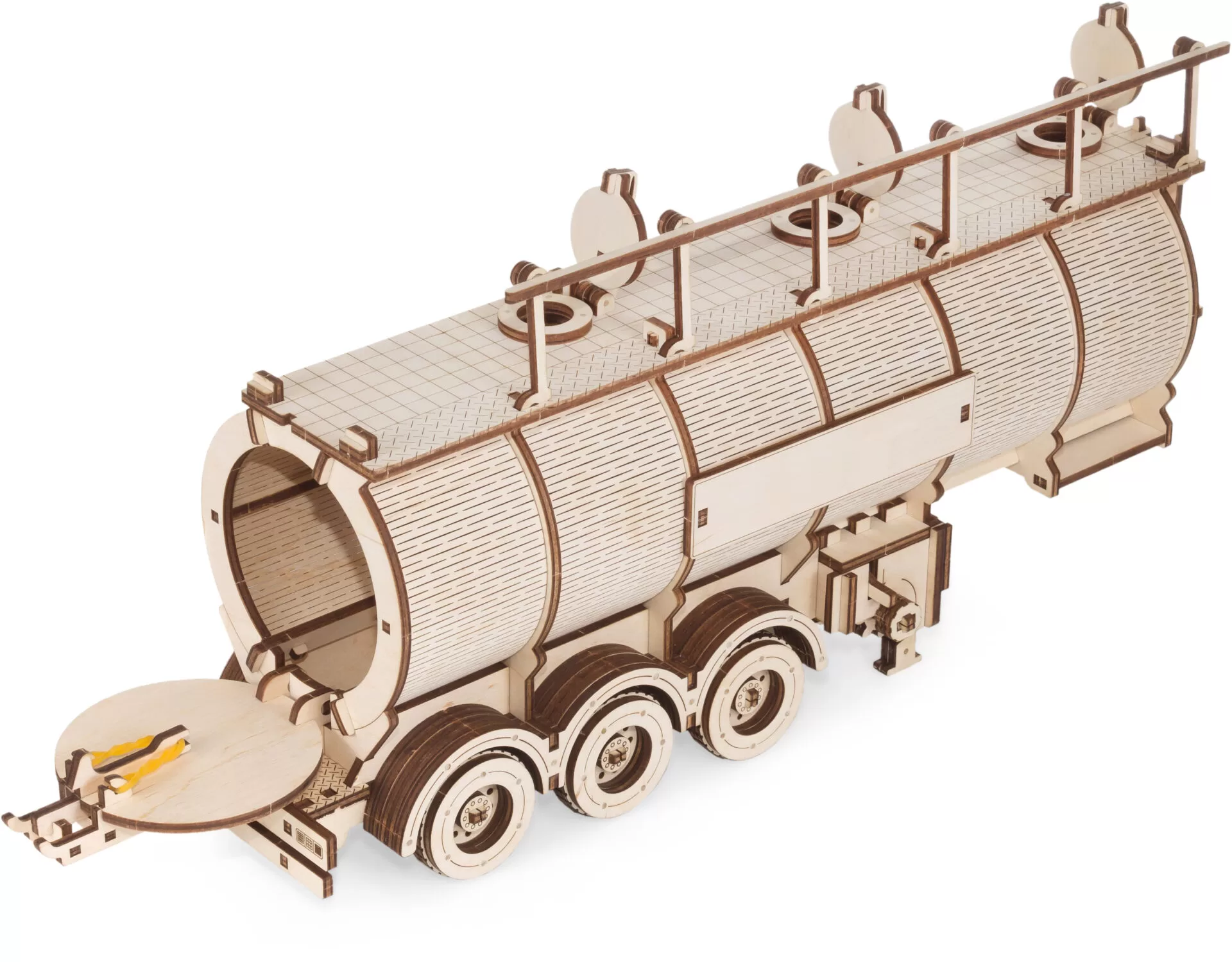 После сборки деревянный полуприцеп-пазл-цистерна выглядит потрясающе благодаря своим замысловатым деталям и реалистичному дизайну. Его можно использовать как декоративный элемент дома или в офисе, а также как игрушку для любителей грузовиков и головоломок.